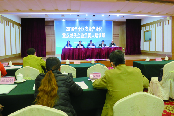 2016年度全區(qū)農(nóng)業(yè)產(chǎn)業(yè)化重點(diǎn)龍頭企業(yè)培訓(xùn)班于12月22日在南寧舉辦,正五海產(chǎn)與廣西中糧、常樂(lè)蠶絲、利添科技等8家北海本土企業(yè)與全區(qū)其他市農(nóng)業(yè)局(農(nóng)委)分管領(lǐng)導(dǎo)、農(nóng)業(yè)產(chǎn)業(yè)化辦公室負(fù)責(zé)人以及自治區(qū)農(nóng)業(yè)產(chǎn)業(yè)化重點(diǎn)龍頭企業(yè)代表共130多人參加培訓(xùn)。旨在認(rèn)真貫徹落實(shí)自治區(qū)黨委、政府的決策部署,交流學(xué)習(xí)龍頭企業(yè)在參與示范區(qū)創(chuàng)建、產(chǎn)業(yè)扶貧、企業(yè)創(chuàng)新管理以及文化建設(shè)等方面的主要經(jīng)驗(yàn)和做法,