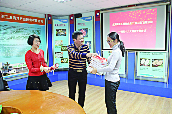 12月7日,北海高新區(qū)黨工委委員、管委會副主任傅文偉到正五海產(chǎn)公司海洋產(chǎn)業(yè)聯(lián)合黨支部開展服務(wù)企業(yè)“三有三送”主題活動——黨的十九大精神專題宣講,傳達了《中共北海市委員會關(guān)于認真學(xué)習貫徹自治區(qū)黨委彭清華書記在北海市學(xué)習宣傳貫徹黨的十九大精神座談會上的講話的通知》,向北海高新區(qū)海洋產(chǎn)業(yè)聯(lián)合黨支部贈送了書籍,為黨員們上了一堂生動的黨課。