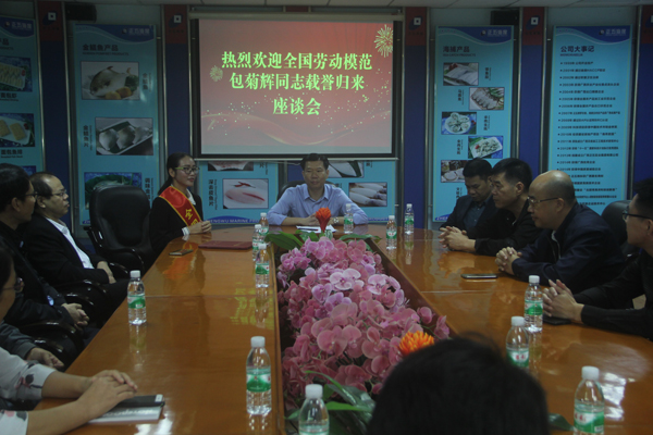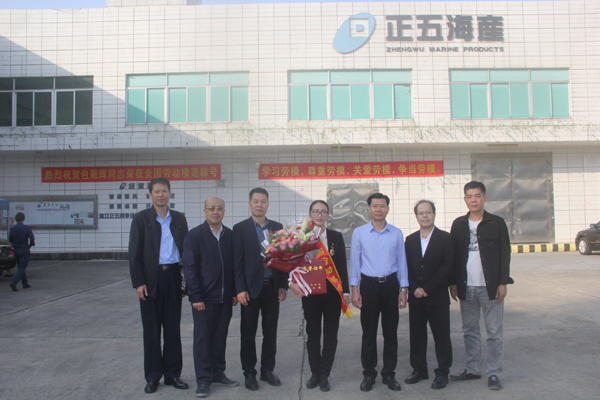 11月27日上午,正五集團(tuán)公司熱烈歡迎“全國(guó)勞動(dòng)模范”包菊輝同志載譽(yù)歸來(lái)。集團(tuán)公司董事長(zhǎng)黃禮雄帶領(lǐng)集團(tuán)總經(jīng)辦成員及各公司負(fù)責(zé)人、部門經(jīng)理在正五海產(chǎn)公司廣場(chǎng)熱烈歡迎。
