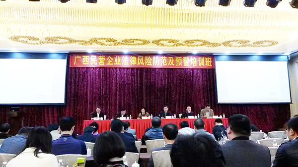 11月11日,廣西區(qū)高級(jí)人民法院、檢察院、公安廳、工商聯(lián)四部門在南寧聯(lián)合舉辦“廣西民營(yíng)企業(yè)法律風(fēng)險(xiǎn)防范和預(yù)警培訓(xùn)班”。正五集團(tuán)公司總經(jīng)理助理袁海祺參加了本次培訓(xùn)。