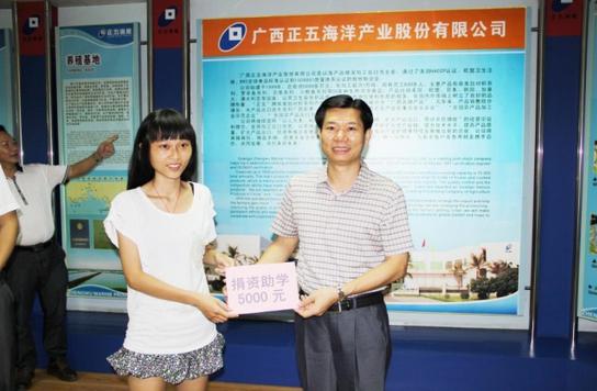 2013年8月29日上午,北海市銀海區(qū)委宣傳部、區(qū)團(tuán)委、建設(shè)局,銀灘鎮(zhèn)黨委、社會(huì)保障服務(wù)中心、鎮(zhèn)團(tuán)委在正五公司為家住銀灘鎮(zhèn)北背嶺村的高考生林慶真舉行了一場簡潔而隆重的捐資助學(xué)儀式。董事長黃禮雄代表正五公司向林慶真捐款5000元,銀灘鎮(zhèn)各界也向林慶真捐款5000元。